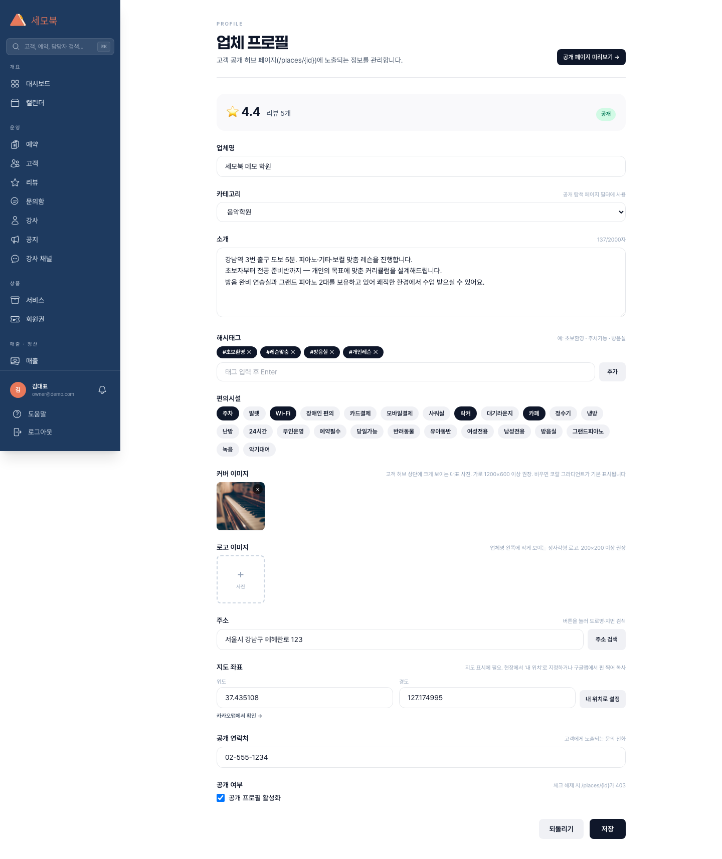 | 소개 | 소개글 · 편의시설 · 영업시간 · 지도 | 영업시간은 설정 → 운영 설정 기반 |