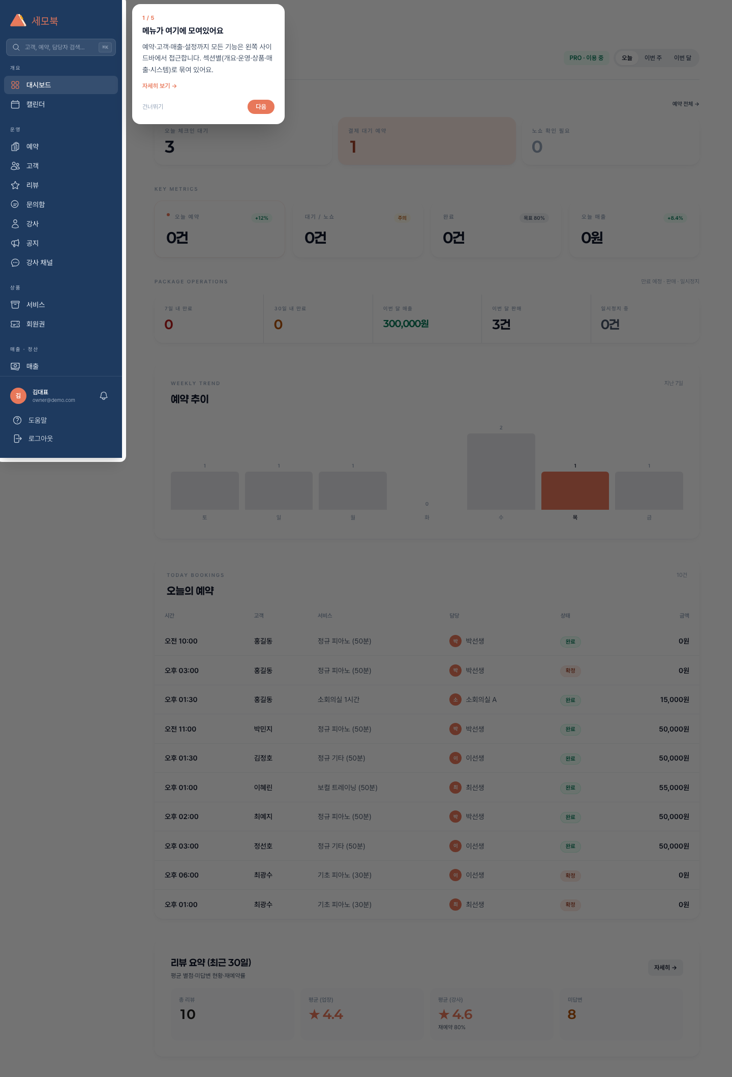 │ 오늘 예약 · 매출 · 신규 고객 · 완료율 │