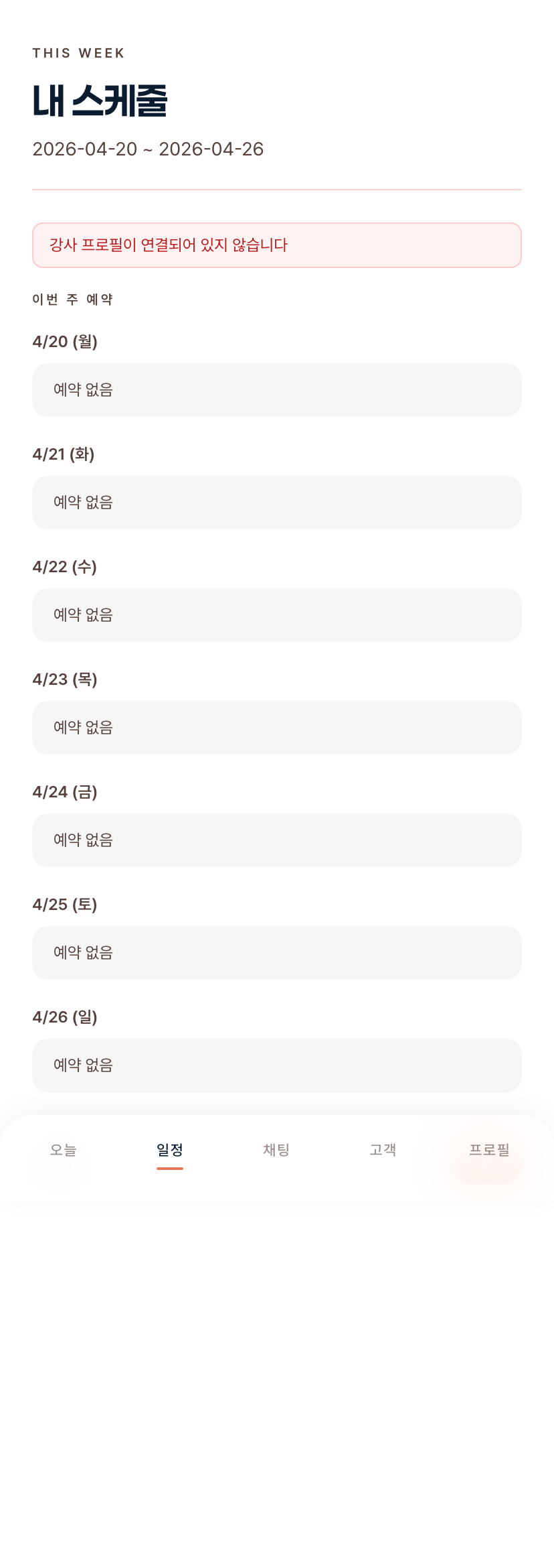 강사 앱 → 일정 — 주·월 뷰로 내 일정 전체 조회.