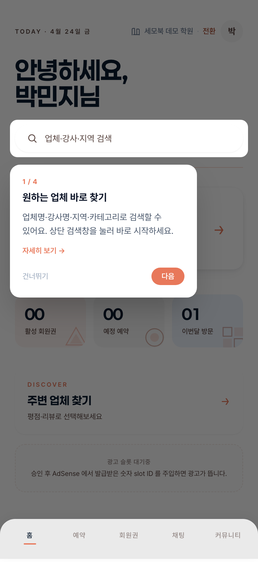 │ 활성 회원권 · 예정 · 방문 │ ← KPI 3개